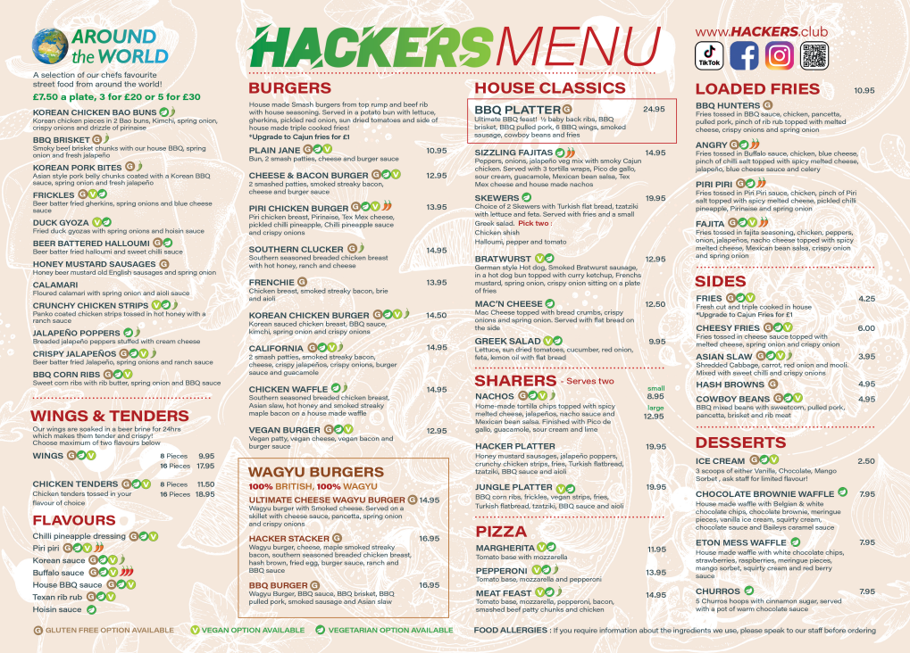 Our vegan menu brings together plant-based versions of Hackers’ favourites, including burgers, pizzas, wings, nachos and sharers. Ideal for a quick bite between games or a full meal with friends.